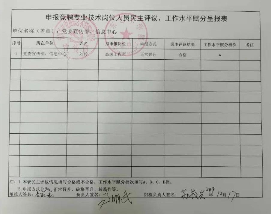 党委宣传部、信息中心申报竞聘专业技术岗位人员民主评议、工作水平赋分呈报表