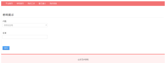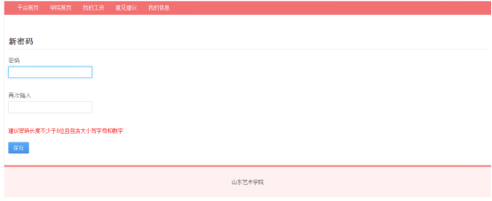 用户首次登录本平台,为安全起见,会要求用户修改默认密码,并设置密码提示问题,如图所示。输入两次密码,建议密码长度不少于8位且包含大小写字母和数字,点击保存按钮后即可修改密码。